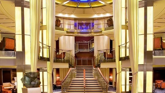 O nosso deslumbrante hall principal recebe-o com uma espetacular escadaria em ónix, pisos em mármore e os primeiros elevadores panorâmicos com vista para o oceano em alto-mar.