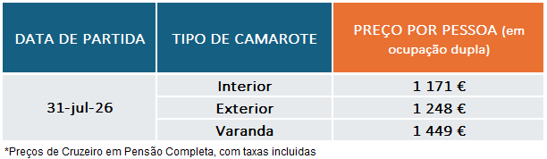 – Entre 119 e 60 dias antes da data de partida: €330 por camarote