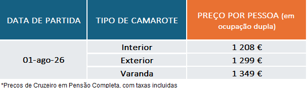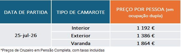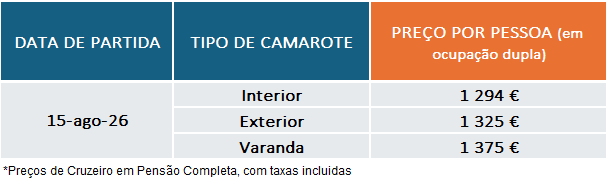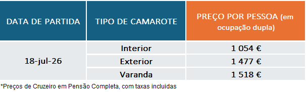 – Entre 119 e 60 dias antes da data de partida: €330 por camarote