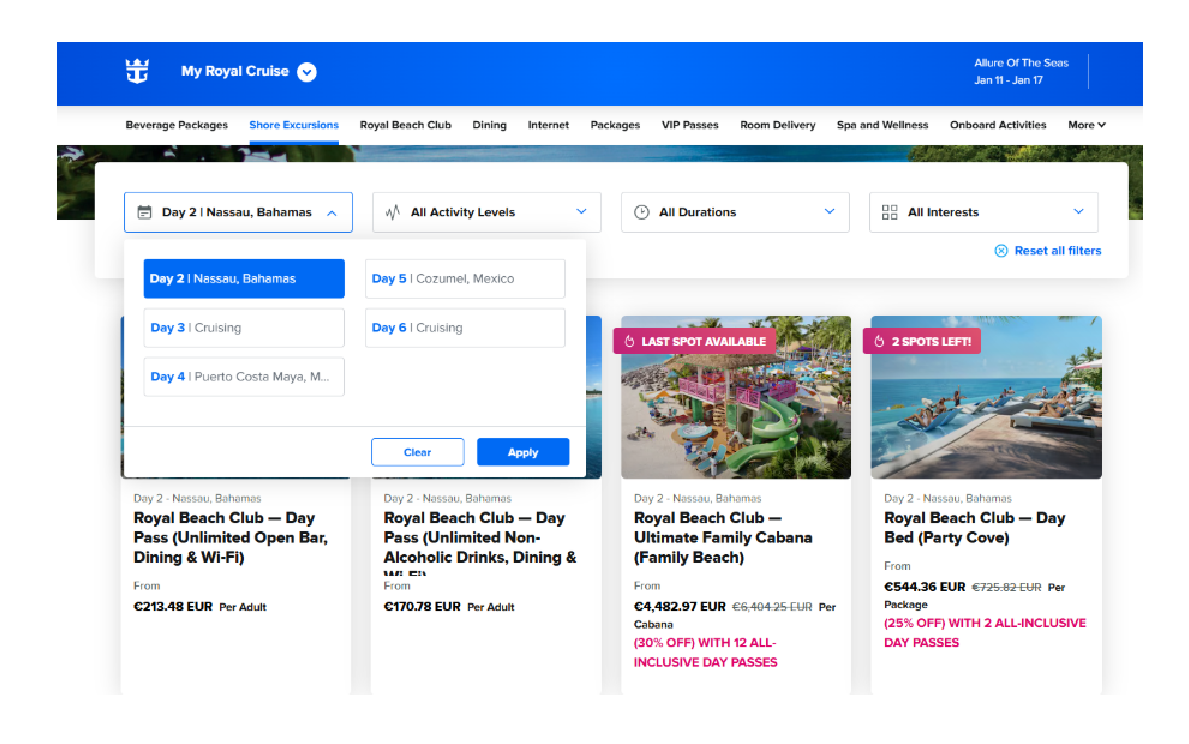 Aceda ao seu Cruise Planner. Selecione Shore Excursions e no filtro All Days and Ports, selecione a escala Nassau, Bahamas