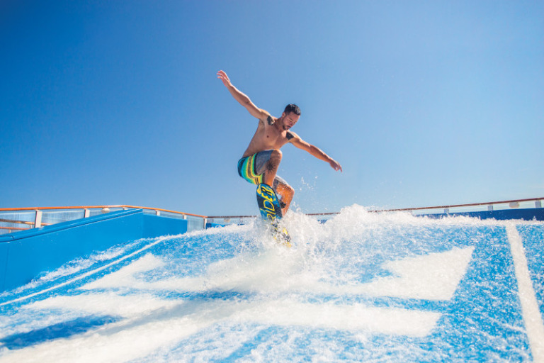 Agarra a prancha e prepara-te para 30 000 galões de pura adrenalina. A onda está sempre pronta no simulador de surf FlowRider® de 12 metros de comprimento.